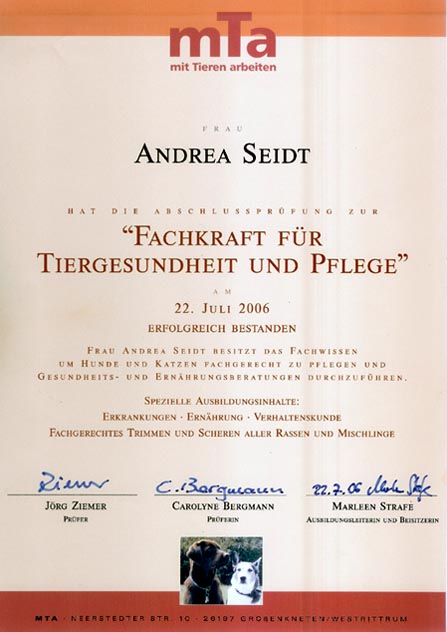 Tiergesundheit und -pflege! Meine fundierten Kenntnisse auf diesen Gebieten biete ich seit Juli 2006 in meinem eigenen Ladengeschäft in Trittau an. Ihre Andrea Seidt |